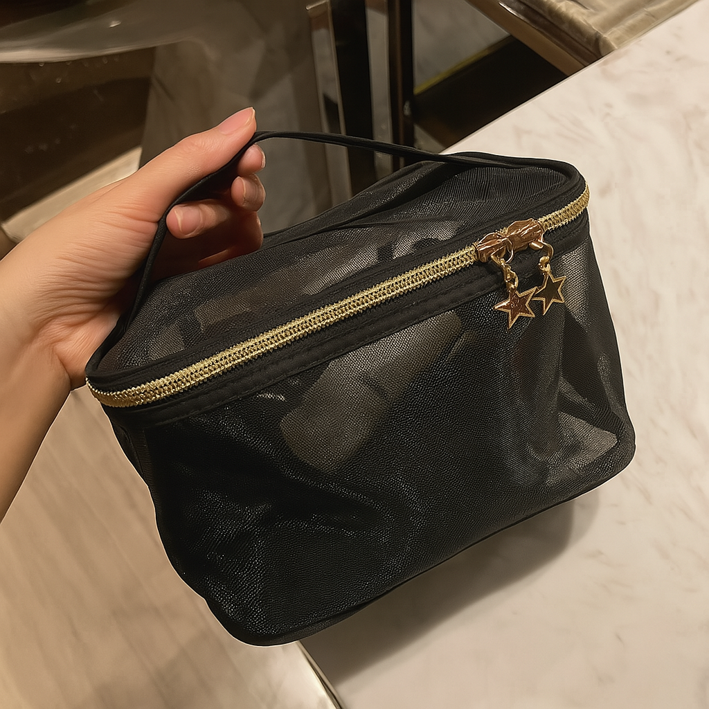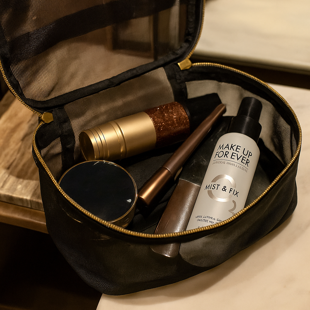 The Glow Mesh Kit Bag lets you see all your daily must-haves at a glance from lip gloss to wipes so you’re always ready, no digging required.